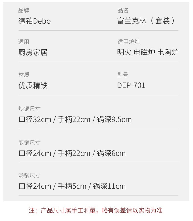 商品名称:debo徳铂富兰克林(套装锅)炒锅 煎锅 汤锅 DEP-701 新疆西藏不发货