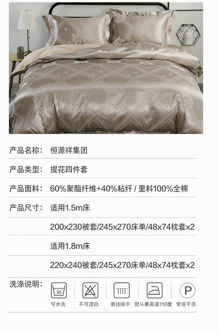 商品名称:恒源祥色织提花四件套 威尼斯(咖)1DB1613被套:200x230cm床单:245x270cm枕套:48x74cm*2