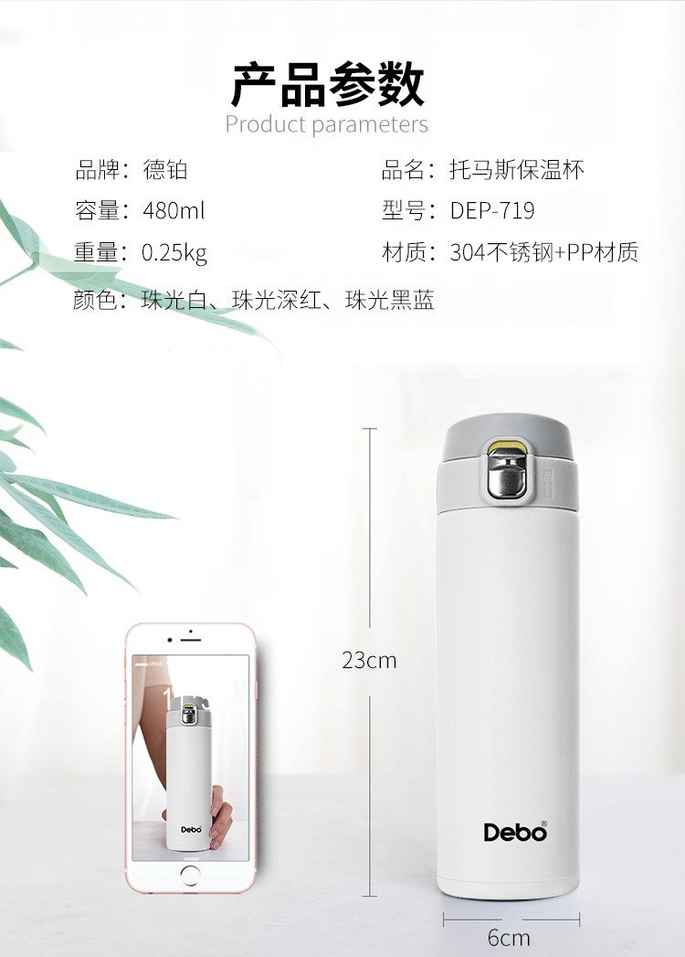 商品名称:Debo德铂托马斯(保温杯)弹跳杯 DEP-719 白色/深红/黑蓝色 新疆西藏不发货