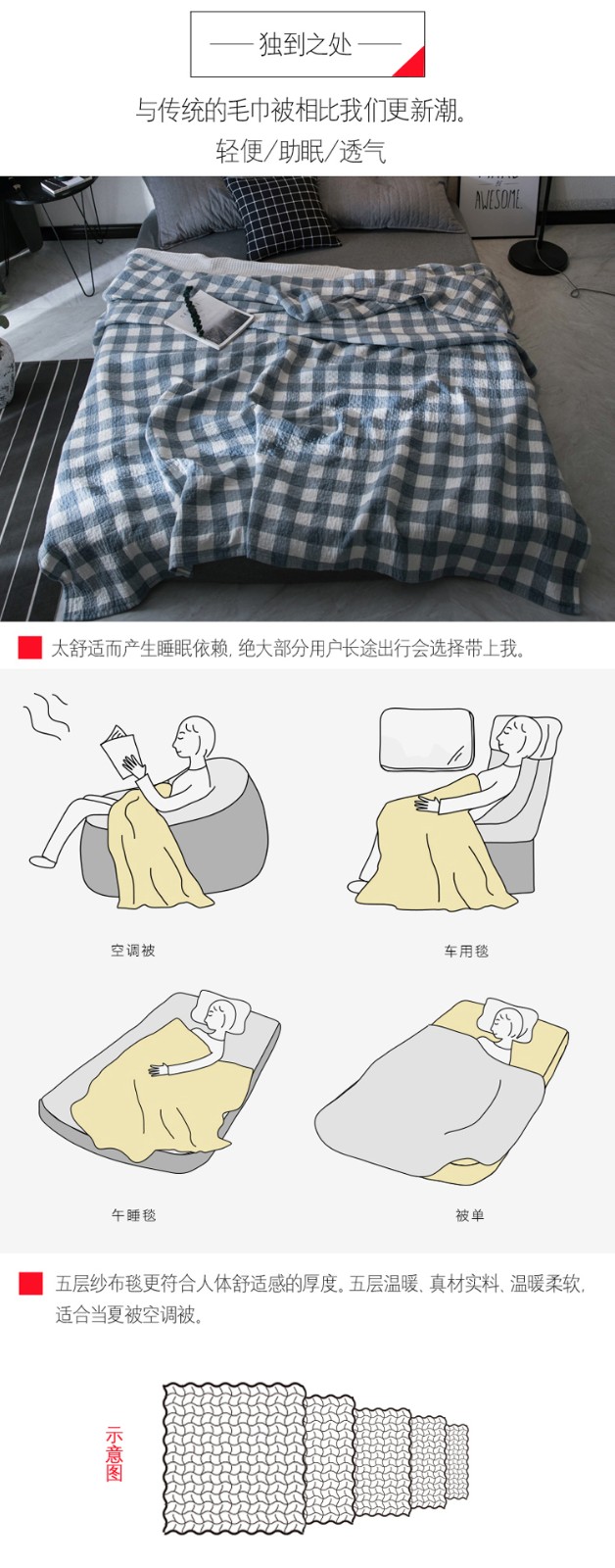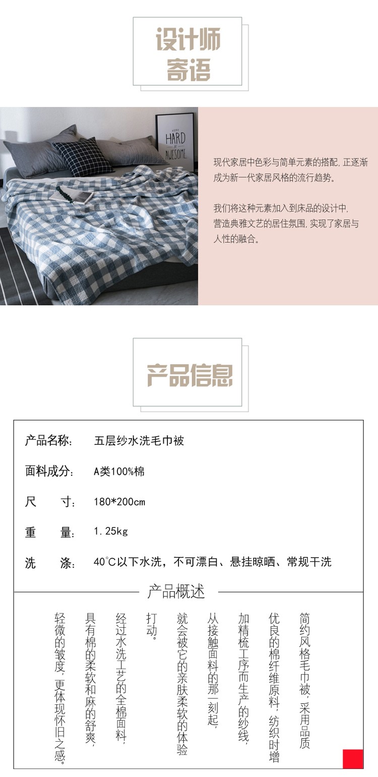 商品名称:悠梦嘉居 YB-1087 五层水洗毛巾被180*200cm 100%棉 格宕(内蒙新疆西藏、青海宁夏甘肃不发)