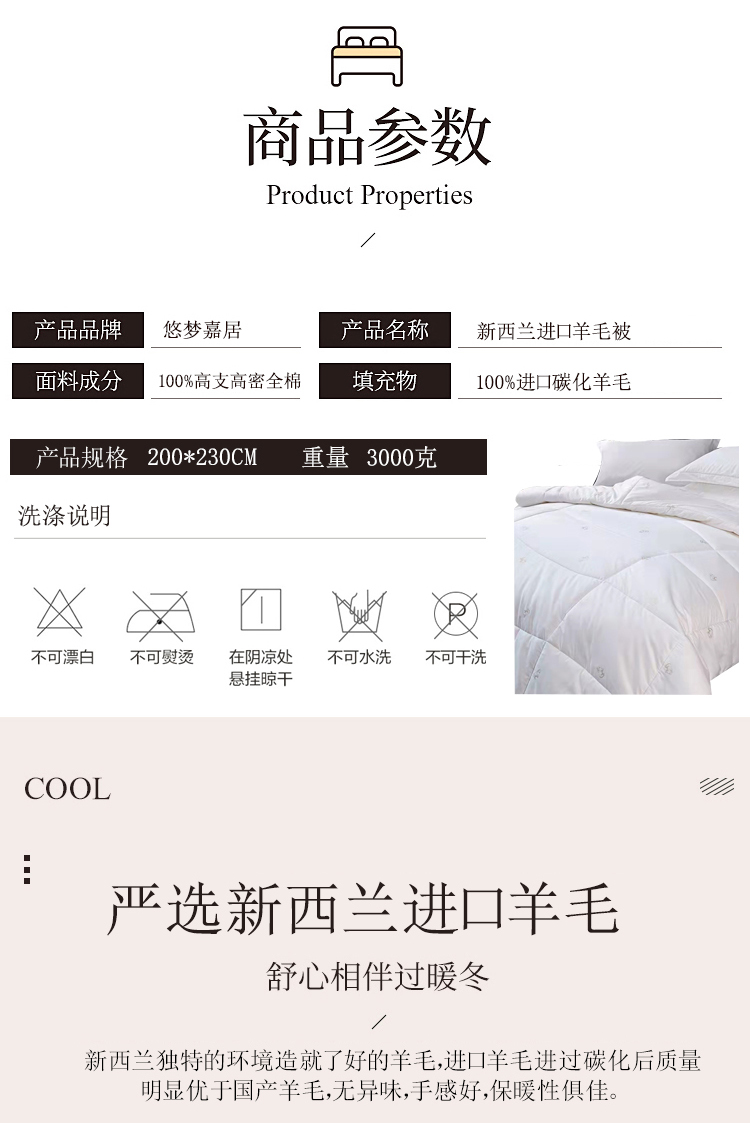 商品名称:悠梦嘉居 YB-1062 新西兰进口羊毛被200*230cm 白色 3kg(内蒙、新疆、西藏、青海、宁夏、甘肃不发)