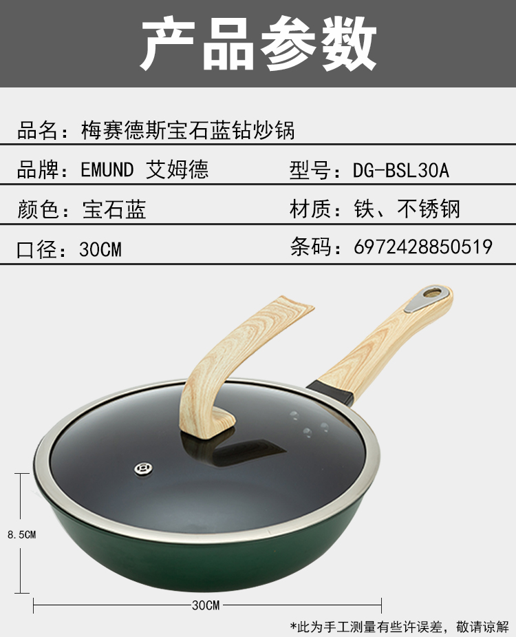 商品名称:EMUND艾姆德 30cm 梅赛德斯宝石蓝钻炒锅 DG-BSL30A 宝石蓝色 新疆西藏不包邮