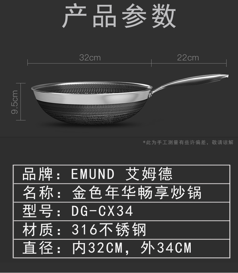 商品名称:艾姆德EMUND 金色年华畅享炒锅 316不锈钢 DG-CX34 新疆西藏不包邮
