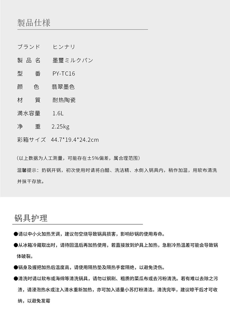 品也陶瓷锅奶锅 PY-TC16 陶瓷不粘锅 陶瓷奶锅单柄宝宝辅食锅婴幼儿熬粥小砂锅煮面热牛奶泡面锅 1.6L