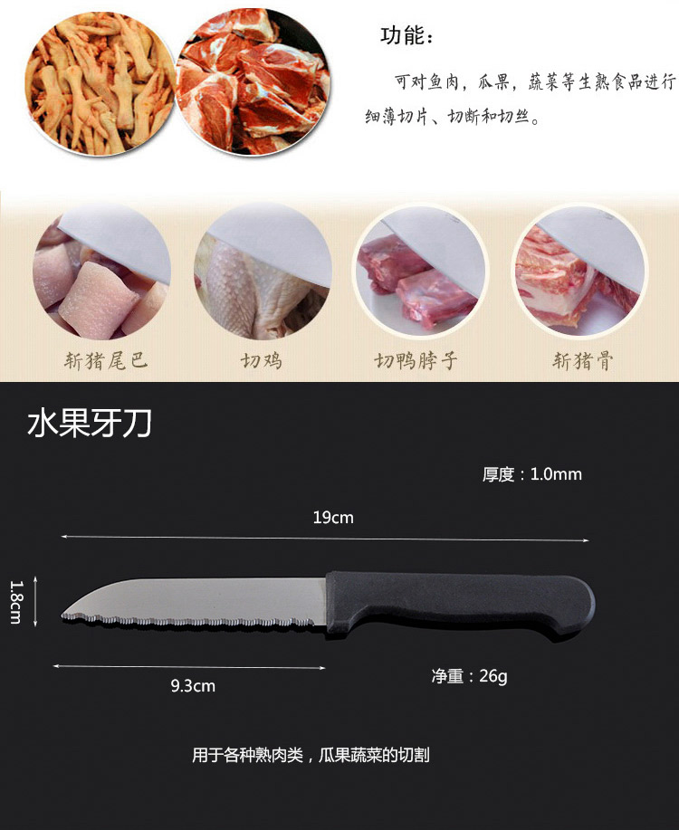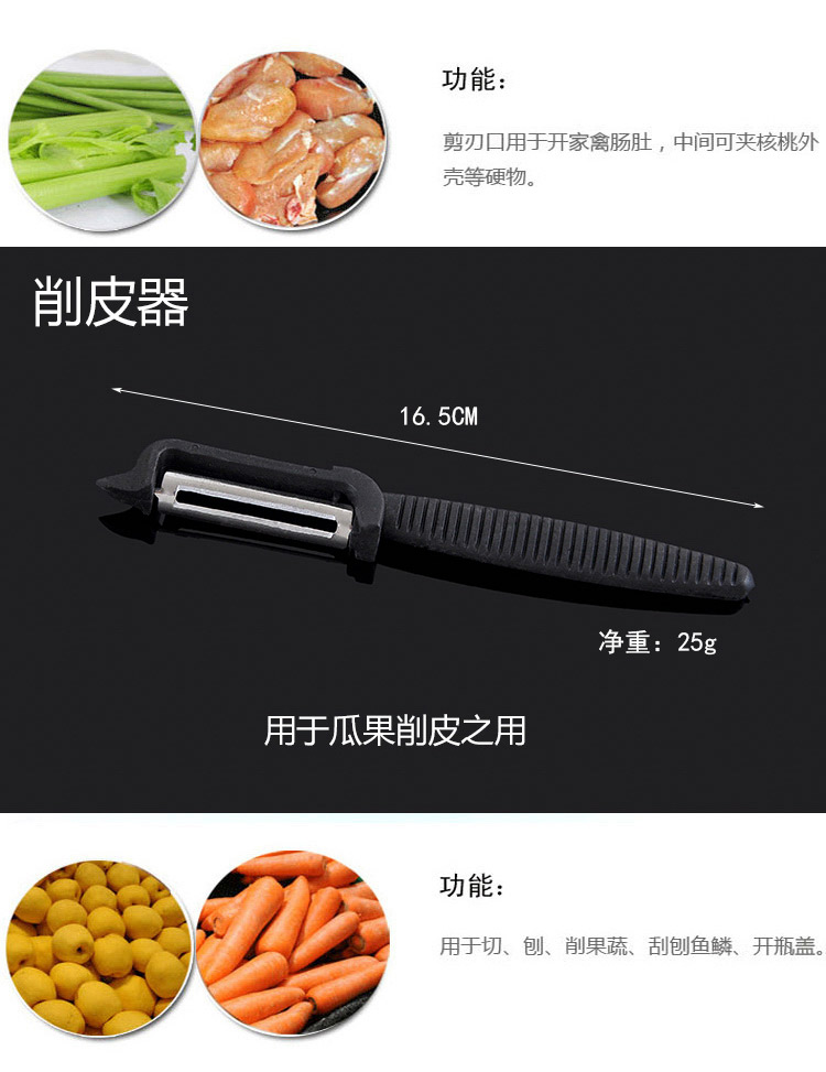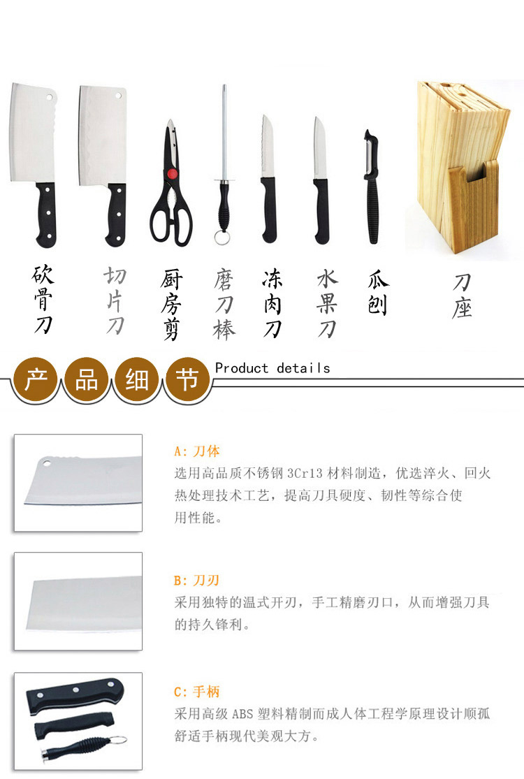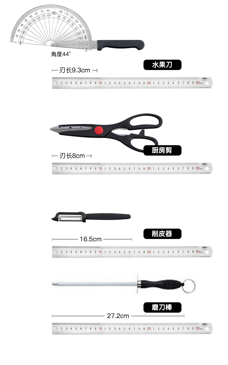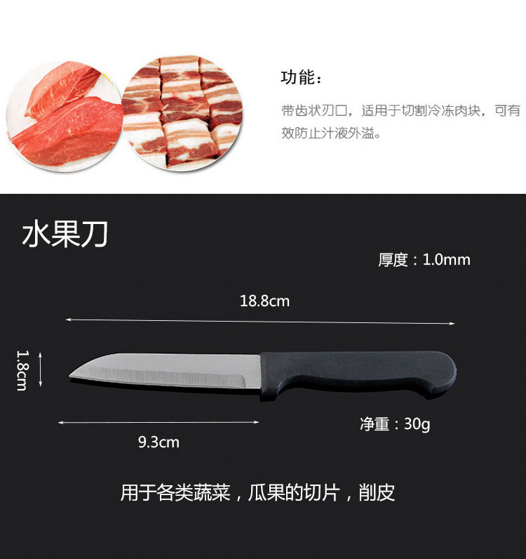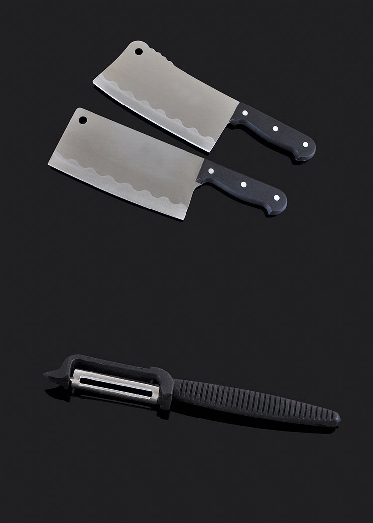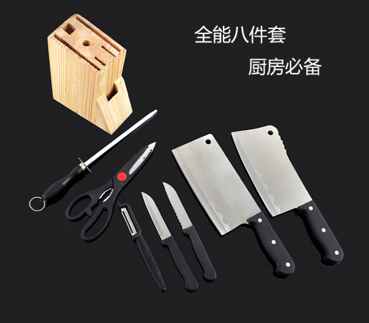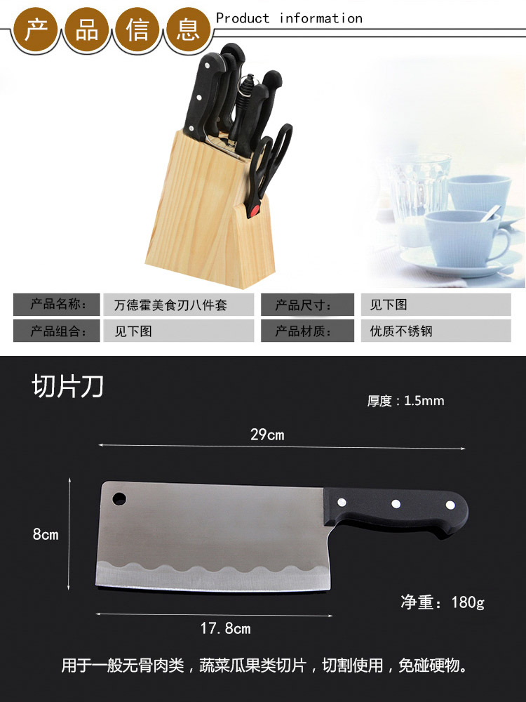 商品名称:万德霍美食刃八件套(切片刀20cm+砍骨刀27.5cm+水果牙刀19cm+水果刀18.8cm+厨房剪21.2cm+削皮器16.5cm+磨刀棒27.2cm) WDH-G0140559