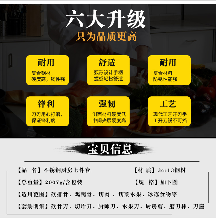 商品名称:翰乐 不锈钢厨房七件套 2007g新疆、西藏、青海不发货,内蒙、海南运费另外加10元