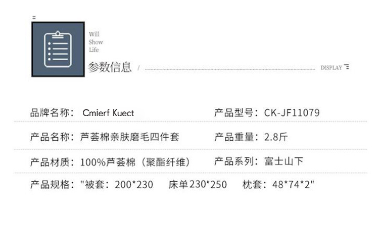 商品名称:Cmierf Kuect (中国CK)简约芦荟棉富士山下亲肤磨毛四件套(被罩200*230cm)CK-JF11079 蓝色 (新疆,西藏,宁夏,青海,内蒙古,甘肃,黑龙江,吉林,辽宁不发货)