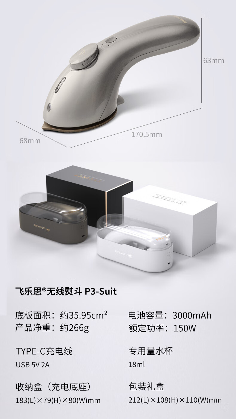 商品名称:飞乐思(FLEXWARM) 无线手持挂烫机小型家用熨斗P3-Suit 优雅白6970616864331 钛金灰 6970616864461 下单备注颜色
