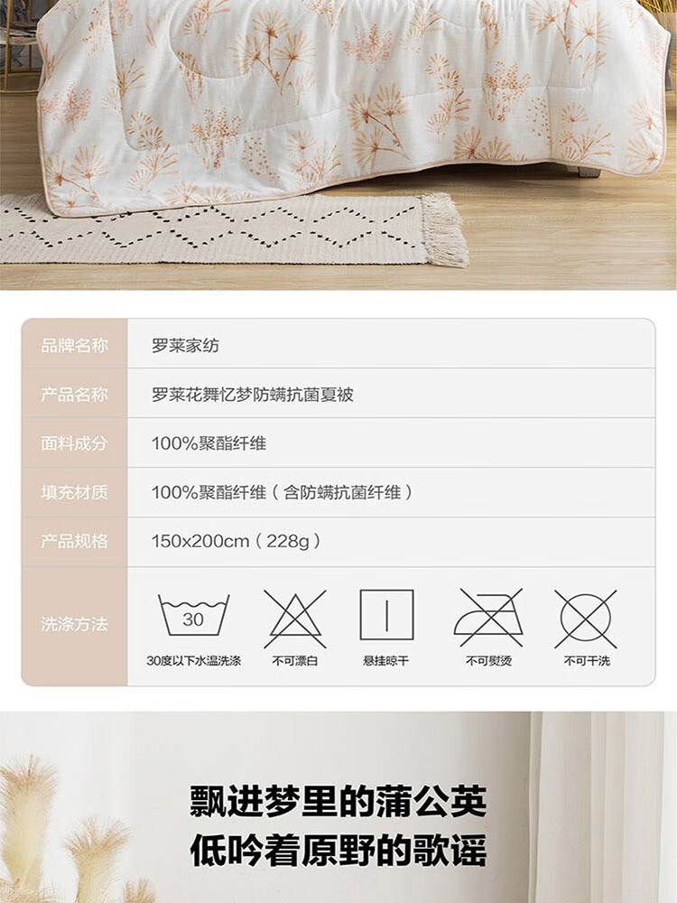 商品名称:罗莱 花舞忆梦防螨抗菌夏被150*200cm 228g 6901974187046