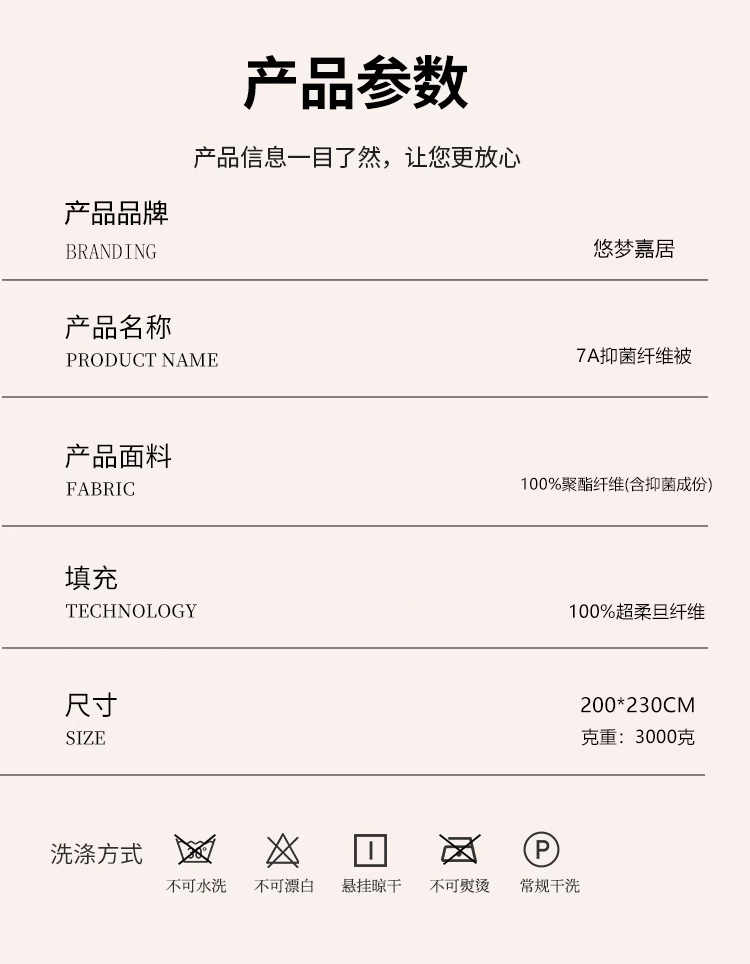 商品名称:悠梦嘉居 YB-14221 7A抑菌纤维被200*230(内蒙、新疆、西藏、青海、宁夏、甘肃运费另算)