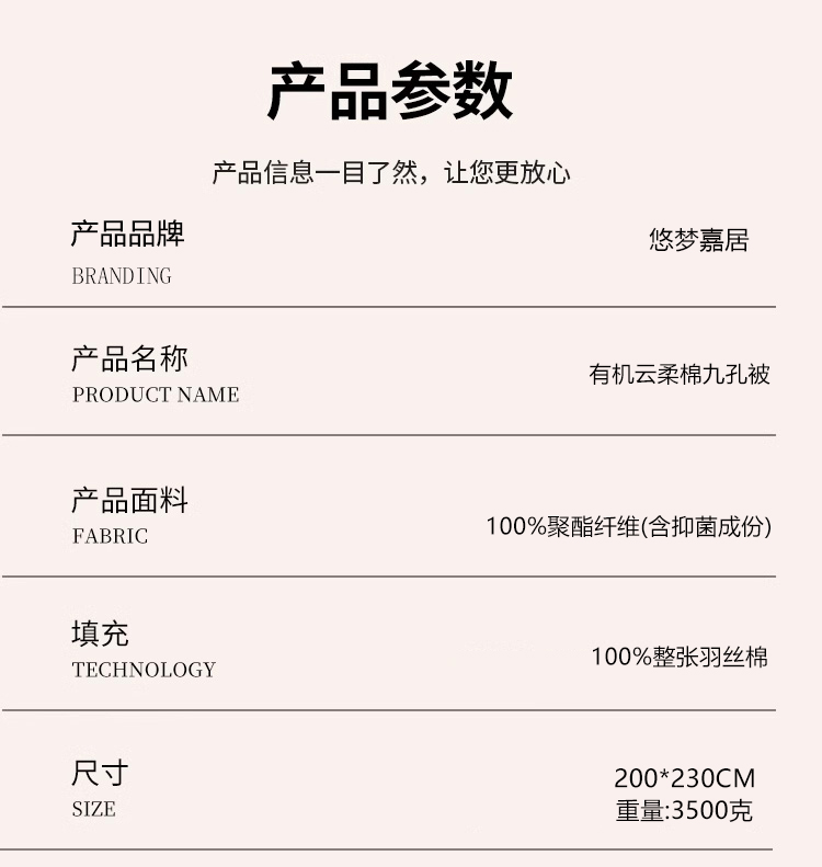商品名称:悠梦嘉居 YB-14223有机云柔棉九孔被200*230(内蒙、新疆、西藏、青海、宁夏、甘肃运费另算)