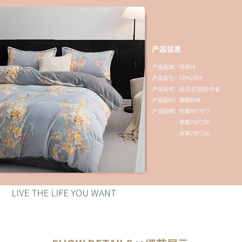 商品名称:恒源祥 丽泽花园绒四件套TBK2064 200*230cm 6941204363376