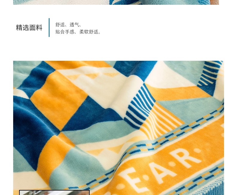 A版:舒棉绒提花面料,克重250克 B版:羊羔绒面料,克重210克,用波浪纹面料包边