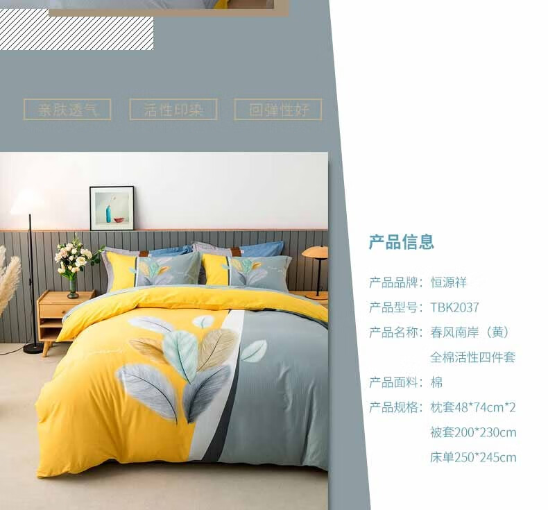 商品名称:恒源祥 春风南岸(黄)全棉活性四件套TBK2037 200*230cm 6941204353933