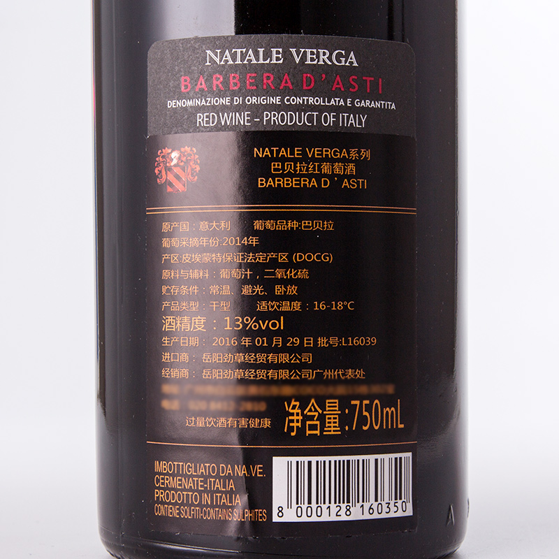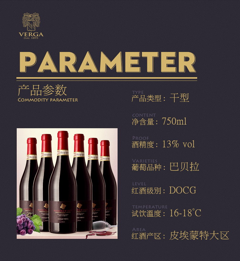商品名称:Verga意大利原瓶级进口红酒 DOCG级巴贝拉干红葡萄酒750ml*6瓶