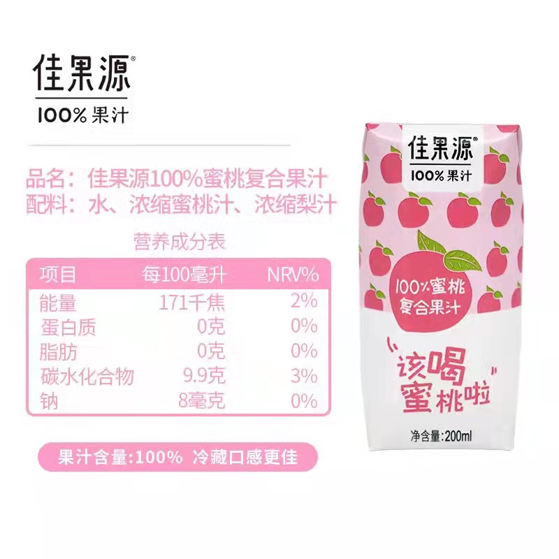 商品名称:佳果源 100%蜜桃复合果汁 24瓶*200ml 6972303251837