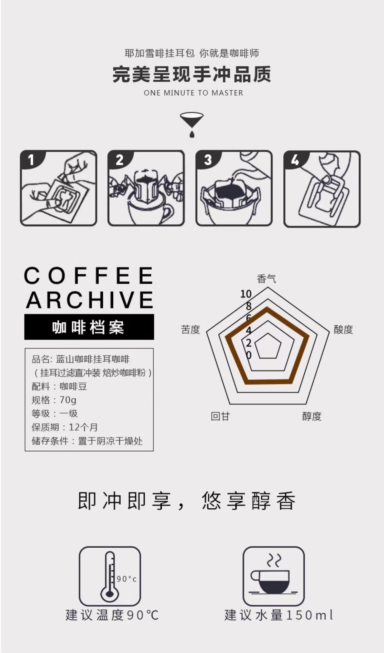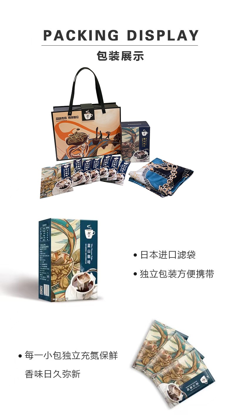 1、蓝山咖啡挂耳*1盒(7*10g) 2、丝巾*1条 (15*145cm55g,材质:仿真丝) 3、专属手提礼盒
