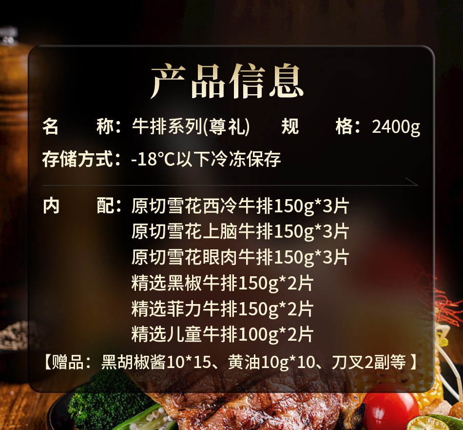 商品名称:首鲜码头 牛排礼盒(尊礼)2400g 包装随机 偏远另加运费
