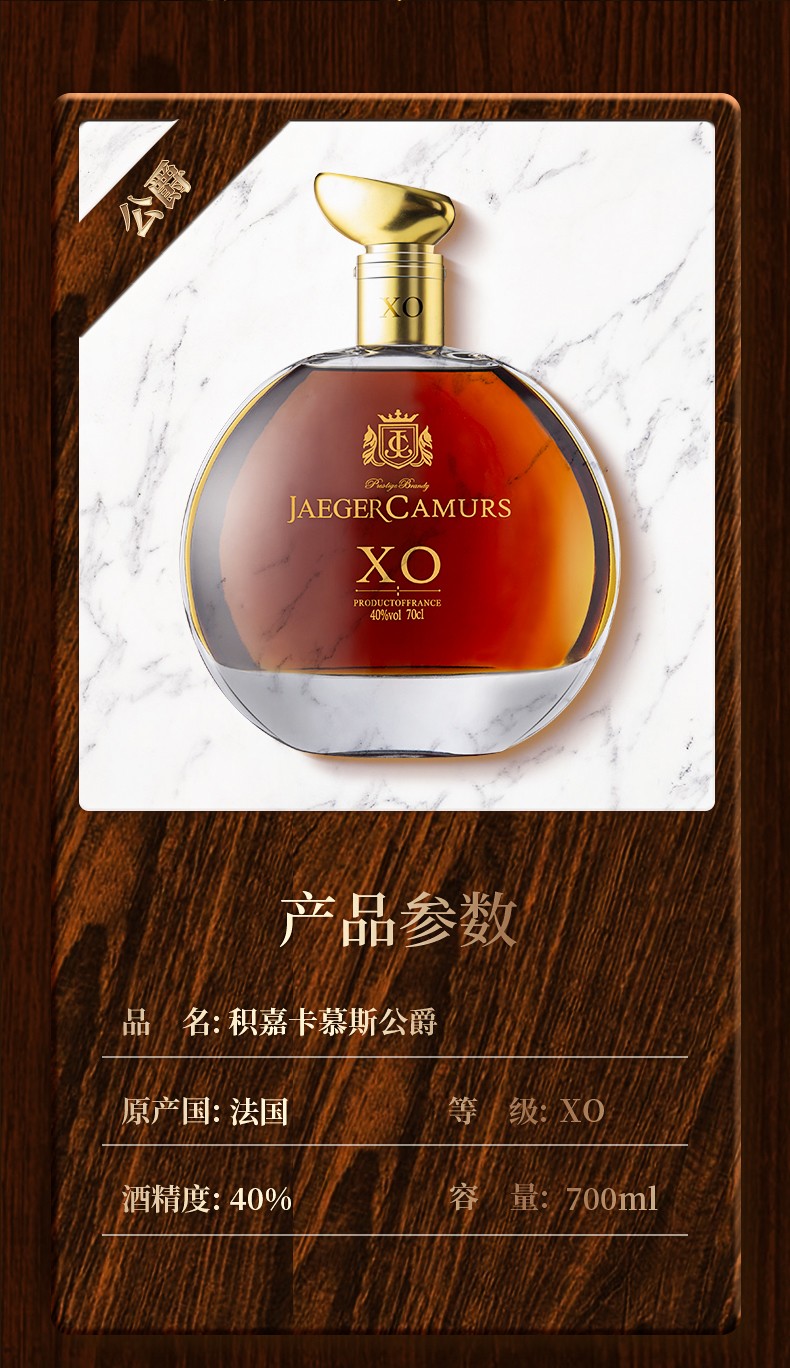 商品名称:积嘉卡慕斯(JAEGER CAMURS)法国进口XO白兰地40度洋酒系列礼盒公爵1瓶*700ml