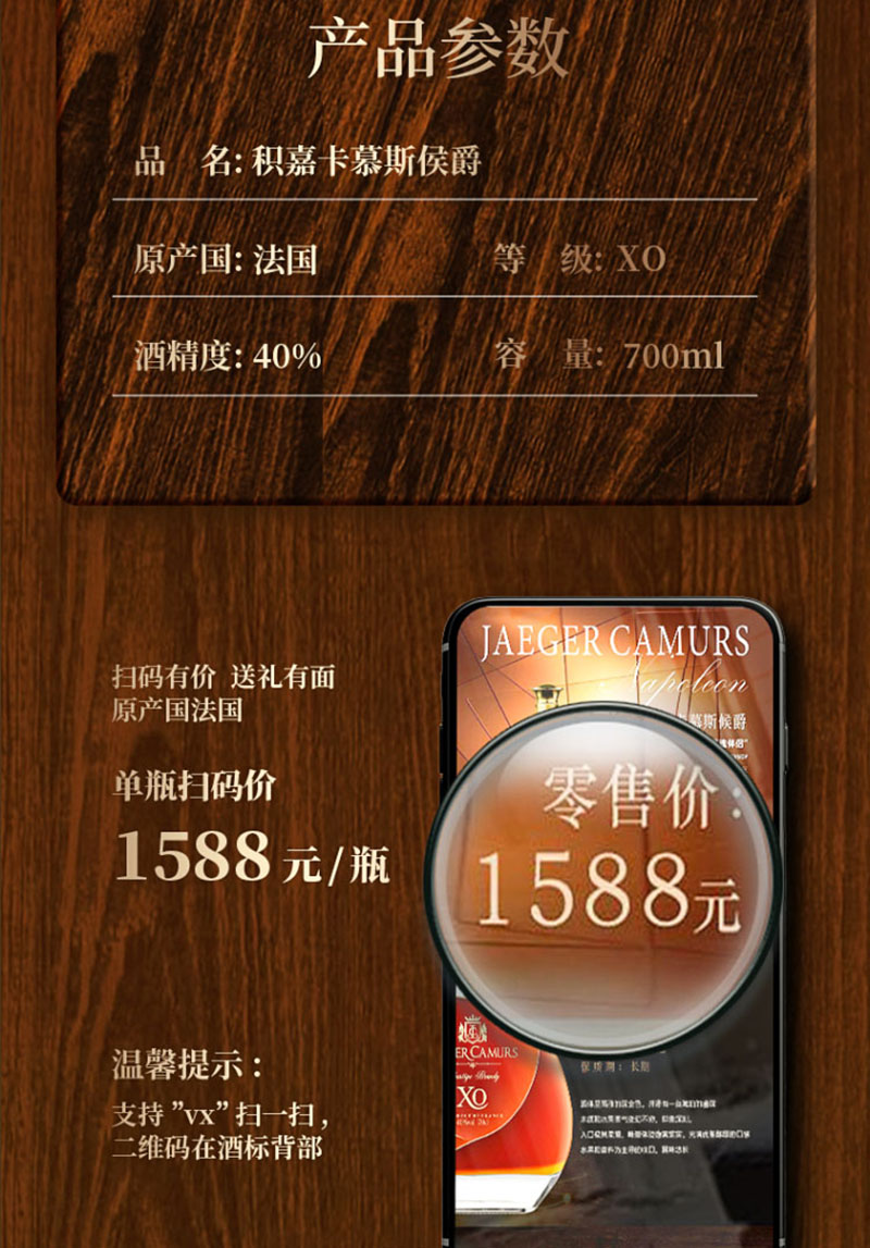 商品名称:积嘉卡慕斯(JAEGER CAMURS)法国进口XO白兰地40度洋酒系列礼盒 侯爵 1瓶*700ml