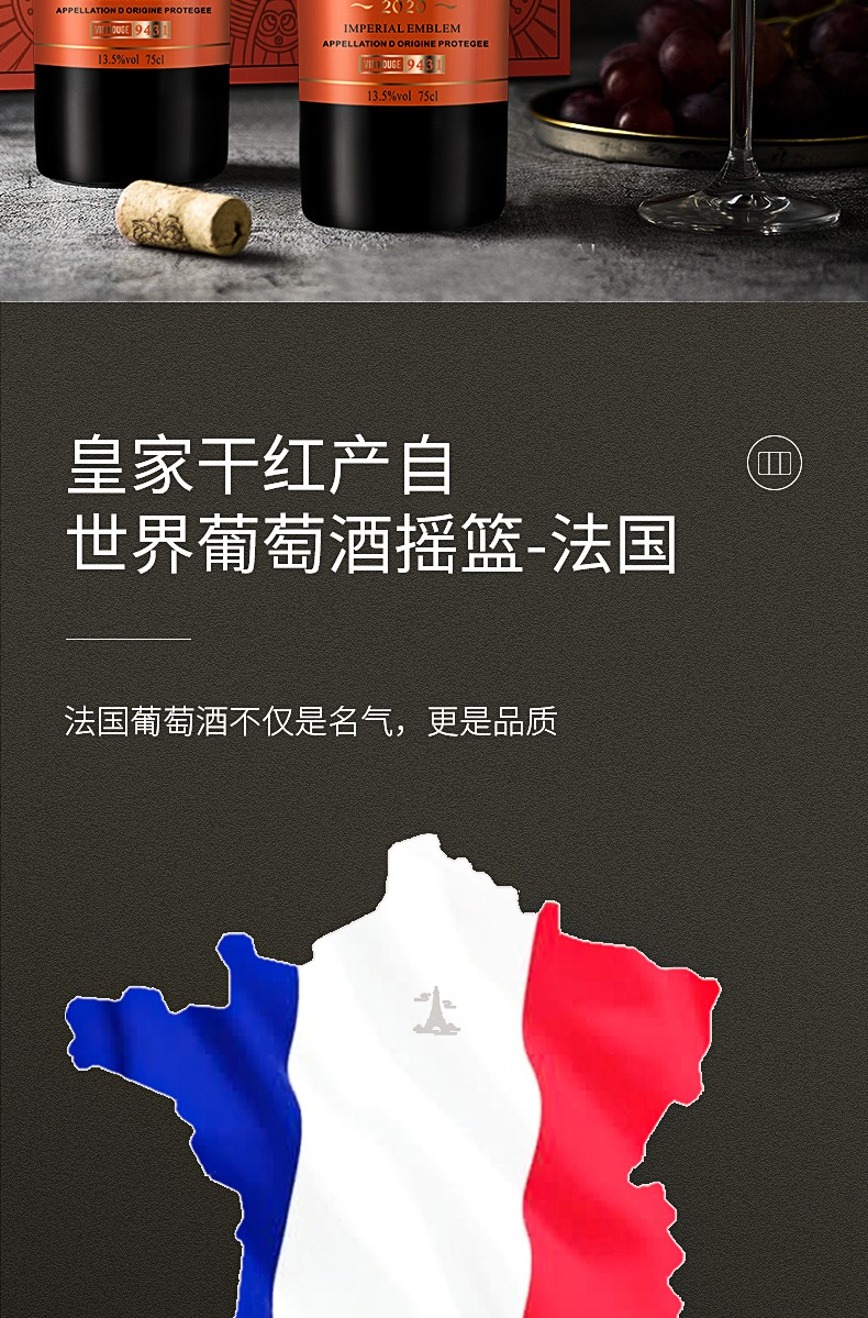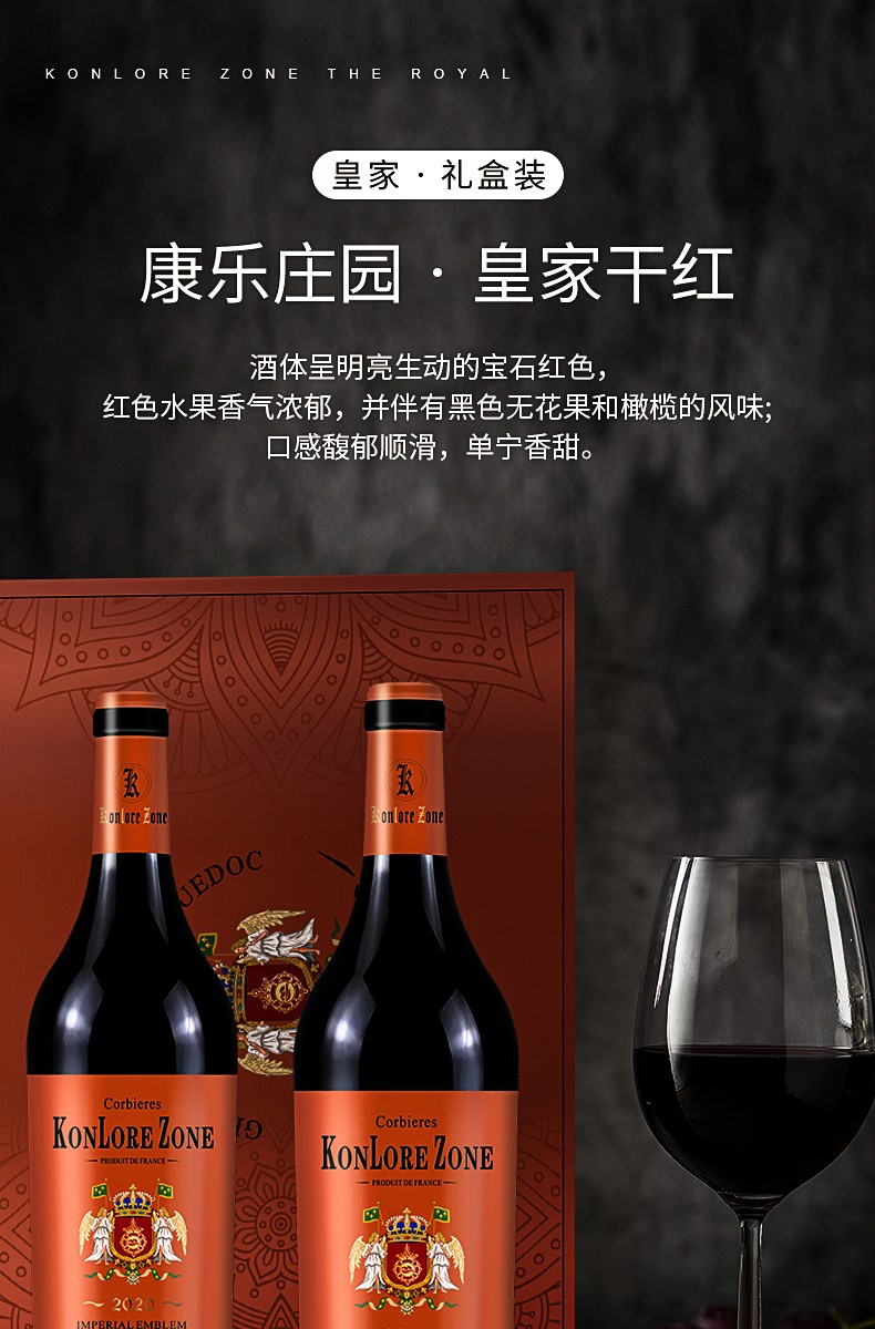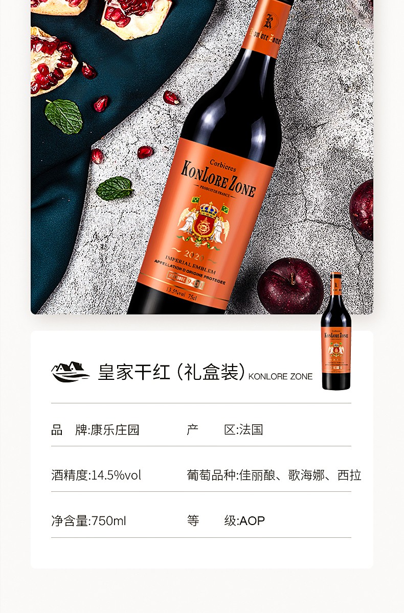 商品名称:康乐庄园 法国红酒混酿 葡萄酒 皇家干红礼盒款 1箱*6瓶*750ml