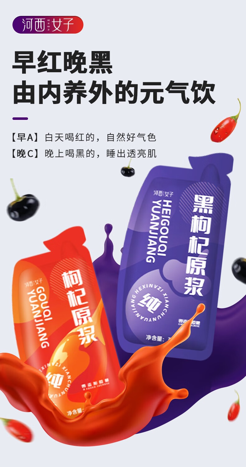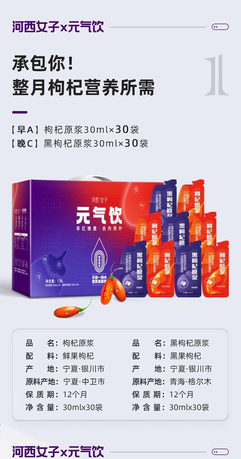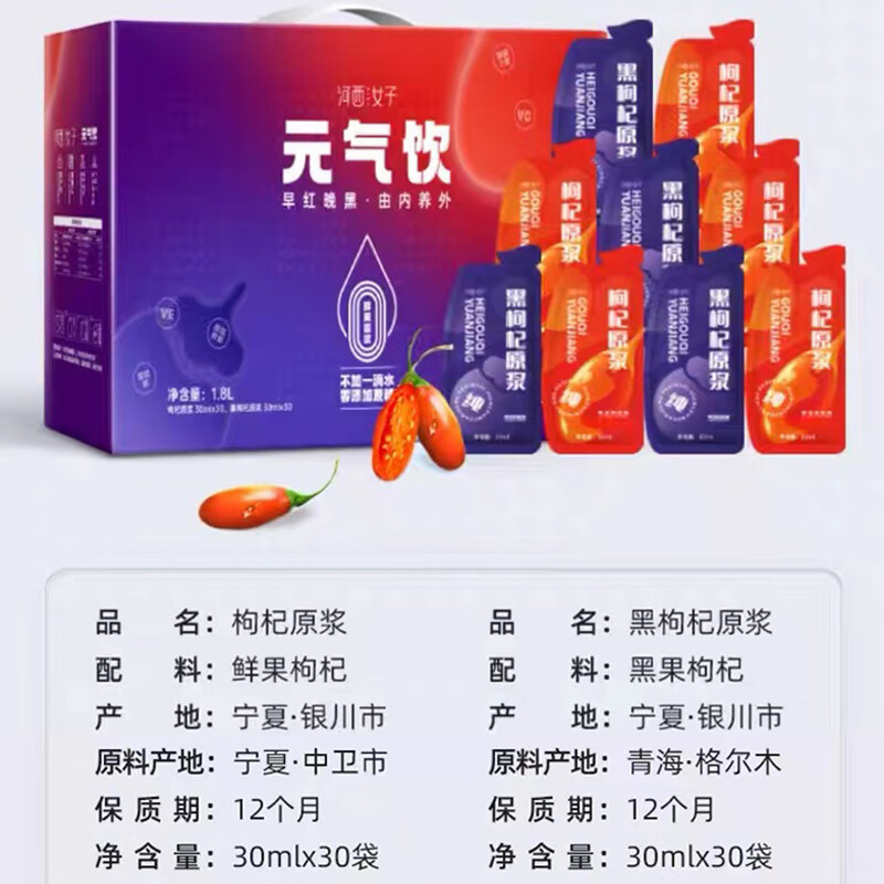 商品名称:河西女子 元气饮礼盒1.8L(枸杞原浆30ml*30袋/黑枸杞原浆30ml*30袋)